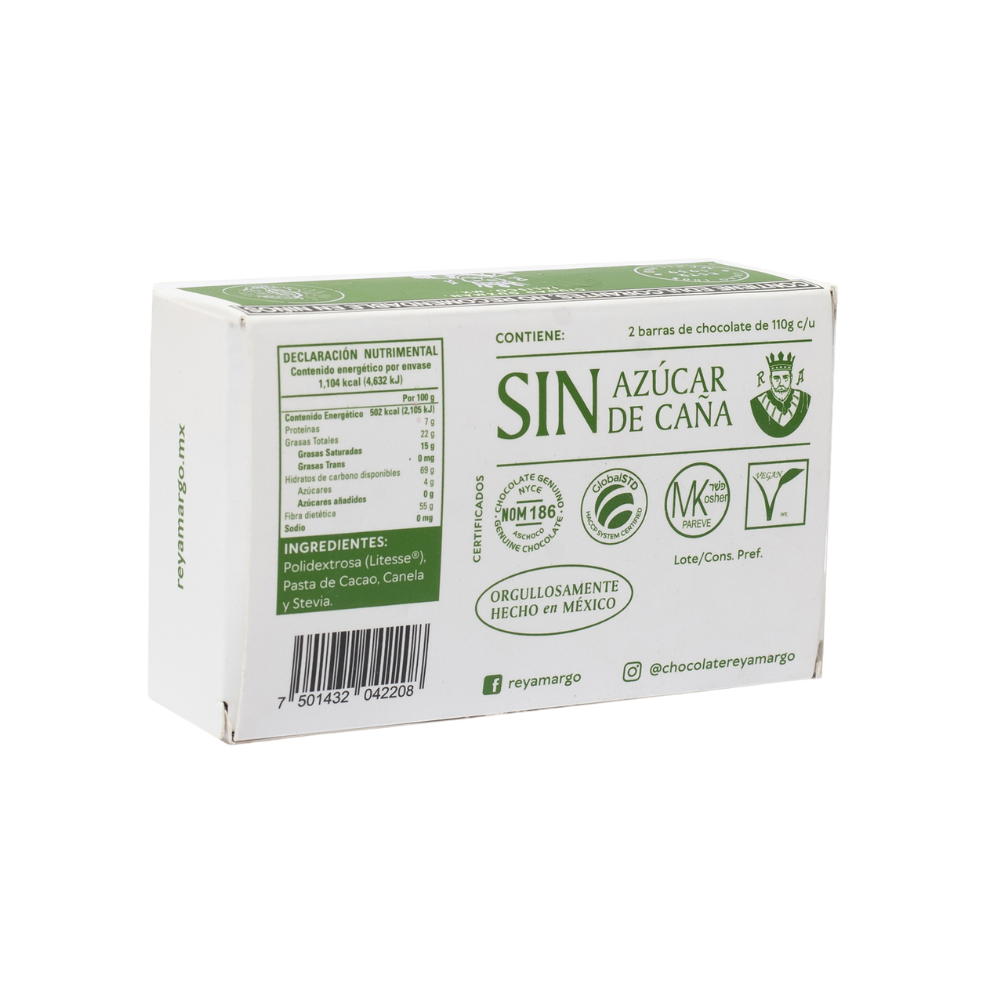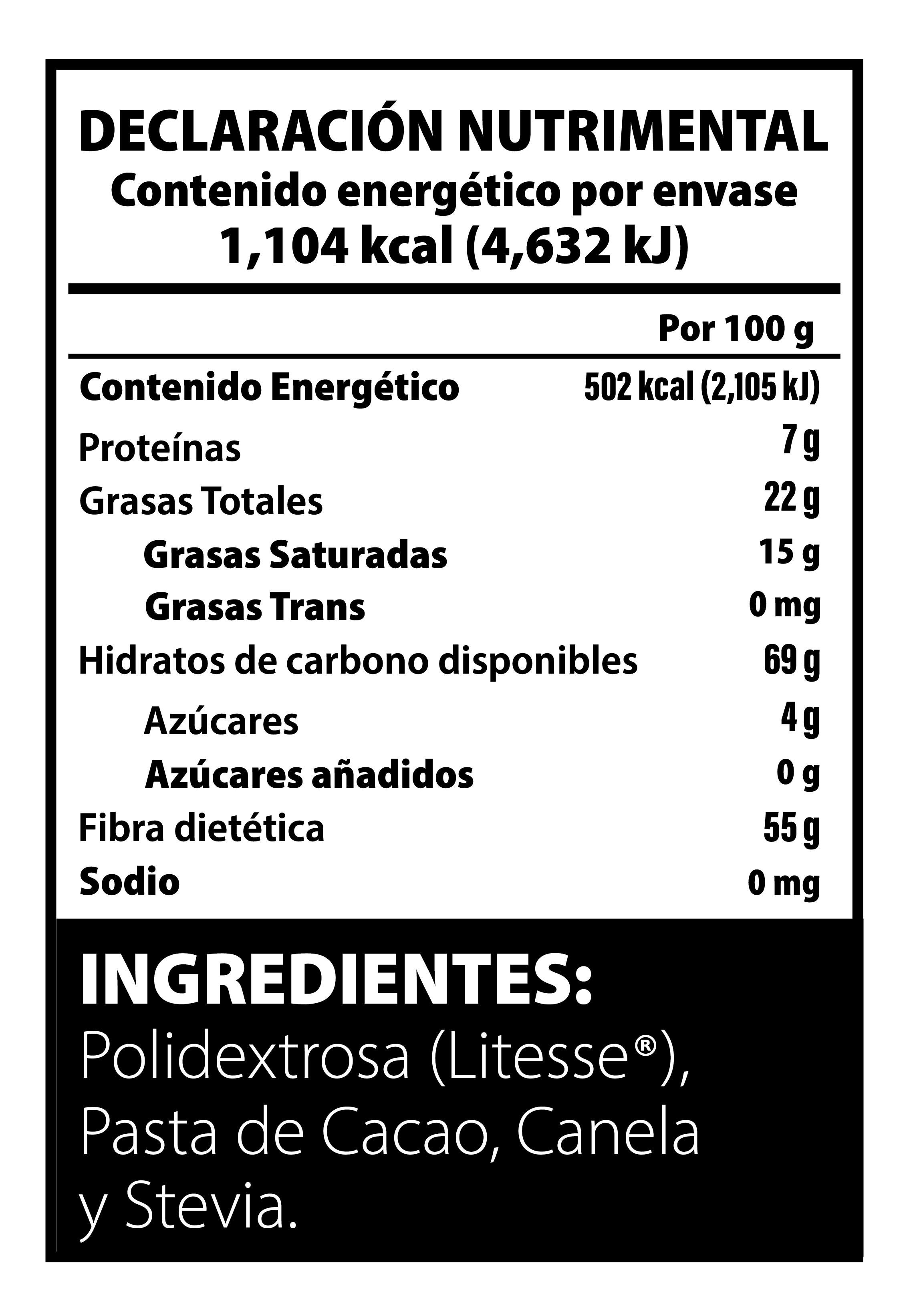 Ingredientes: Litesse (Polidextrosa), Pasta de Cacao, Canela y Stevia.