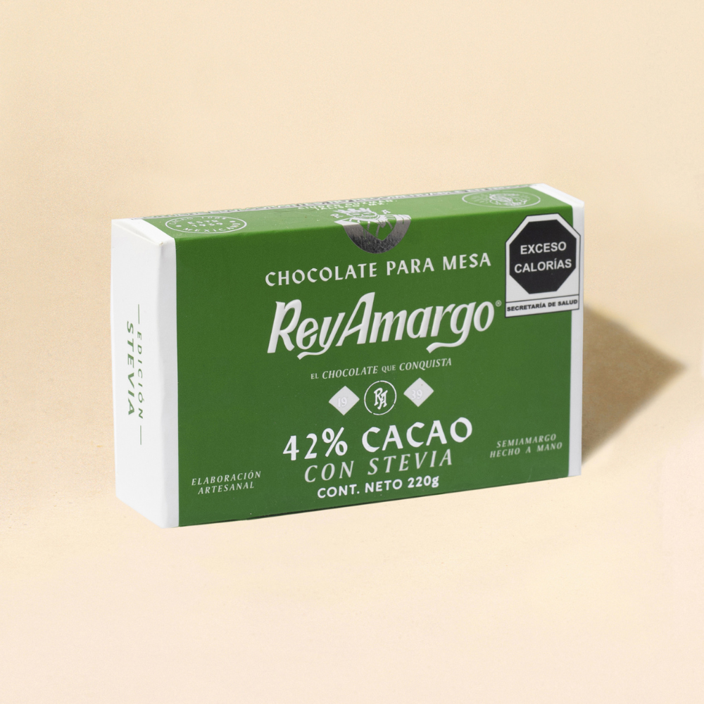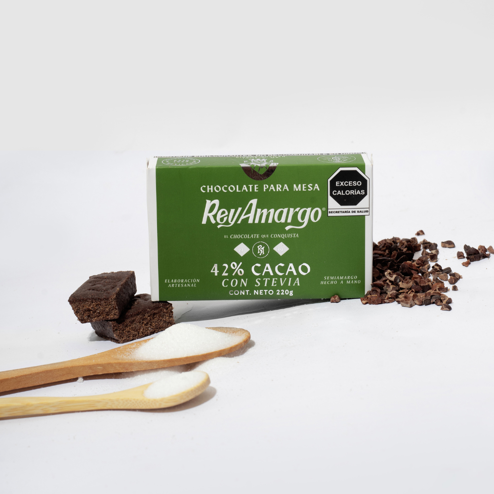 Rey Amargo con Stevia sustituye el azúcar de caña por fibra, manteniendo el sabor del chocolate tradicional para mesa ahora endulzado con Stevia natural.