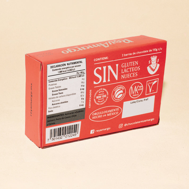 Ingredientes: Azúcar, Pasta de Cacao, Chile de árbol en polvo y Canela.